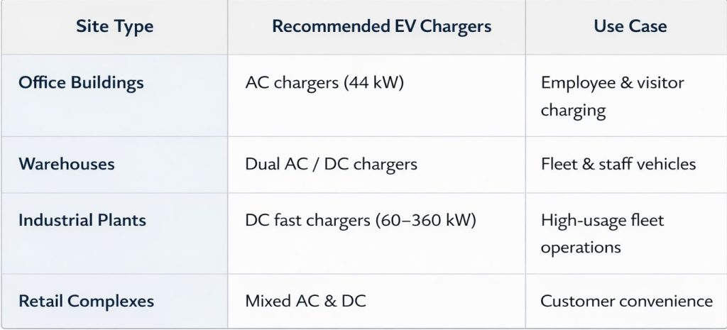 Industrial warehouses, logistics hubs, and commercial campuses offer ample space for organised charger placement. This flexibility supports efficient traffic flow, dedicated charging bays, and future charger additions.Â